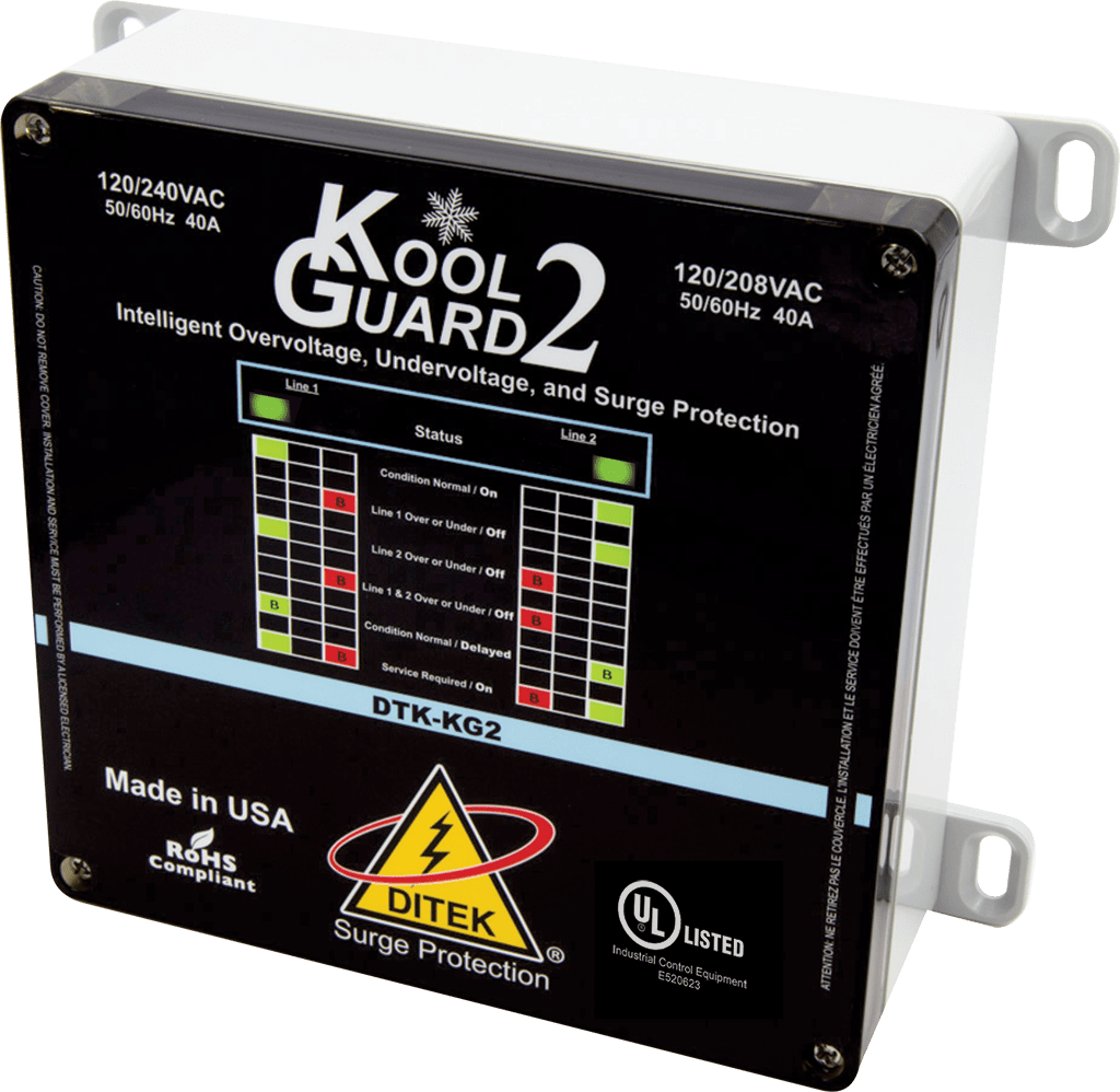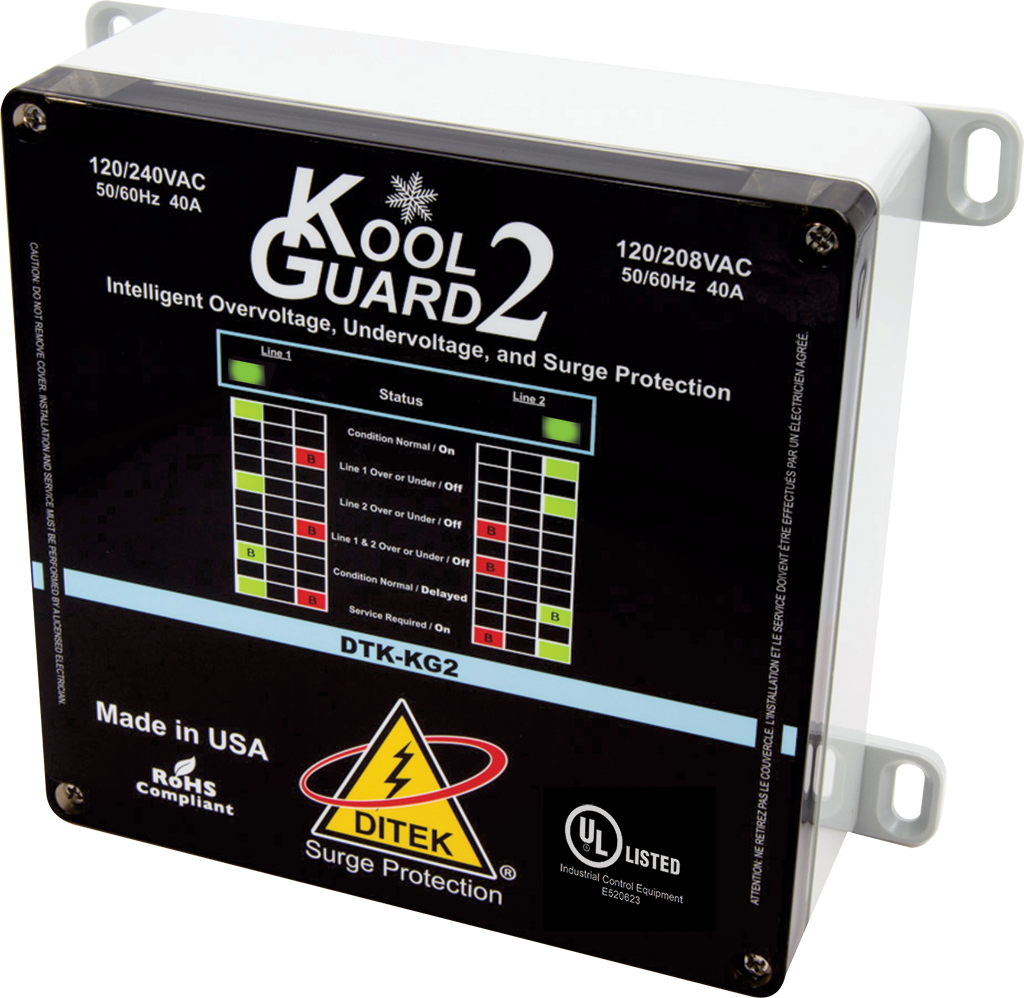 DITEK’s DTK-KG2 is part of the Kool Guard family of voltage monitoring products. It is specifically designed to protect HVAC equipment from harmful undervoltage and overvoltage events that can damage sensitive electronics and mechanical components within the system. The DTK-KG2 also incorporates DITEK’s state-of-the-art surge protection design to shield the equipment from damaging transient voltage surges and spikes. The standard UL Type 4X polycarbonate enclosure allows the unit to be easily installed in harsh outdoor environments.