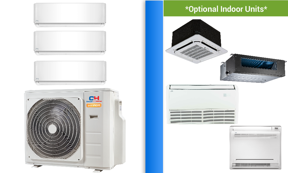 | *This C&H Multi Zone Mini Split Package Includes: *(1) Hyper Multi Zone Outdoor Unit *(2) Wall Mounted Indoor Units (with Remotes) *The outdoor and indoor units can be upgraded via the dropdown boxes above. Features : ˜Heats & Cools (-13F/-13F) ˜Basepan Heater (Built in)˜ ˜Gold Coated Coils˜ ˜Refrigerant Leak Detection ˜Auto Restart˜ Brochure HIGH-FREQUENCY RACER TECHNOLOGY: Enables the compressor to reach maximum speed within 6 seconds on start up HIGH-EFFICIENCY PIPES: 54 teeth to increase heat exchange INTELLIGENT DUSTING SWITCH: Reverses the fan to clean dust and other debris from the coilC&H Multi Zone systems, with inverter technology, are some of today’s most advanced ductless split heat pumps. Up to 5 indoor units can be connected to a single outdoor unit, reducing the number of outdoor units required. All indoor units can be individually controlled and do not need to be installed at the same time. With modern heat pump technology, the Optional Hyper Heat series offers dependable cooling as well as the capability to heat in ambient temperatures as low as -22°F, making it an excellent, energy-efficient solution for colder climates. |